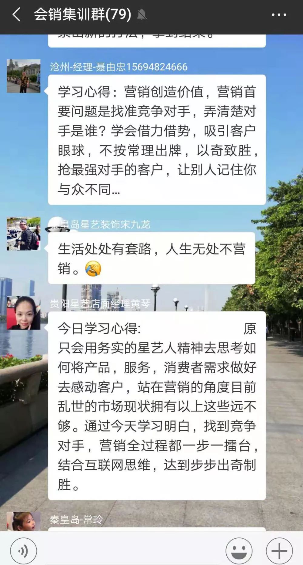 以品宣,以奇勝,打造家裝行業(yè)高效營銷團隊,構建企業(yè)低成本創(chuàng)品牌的快速營銷系統(tǒng)。12月3日至5日,廣東星藝裝飾集團“奇勝營銷”會銷集訓在廣州舉行。來自星藝29家公司的總經(jīng)理、營銷團隊管理者、營銷策劃負責人共70多人參加集訓。集團董事長兼總裁余敏、常務副總裁孫師恒、總裁助理黃勇、行政中心總監(jiān)郝峻、營銷中心總監(jiān)陳和君等到場聽課,對構架星藝營銷系統(tǒng)和打造高效營銷團隊提出具體要求和作出明確指示。